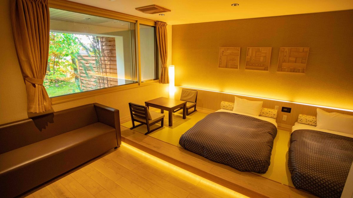 大雪連峰が見渡せる展望露天風呂や露天風呂付きの和室。森、花、大地をイメージした洋室などでおもてなし。