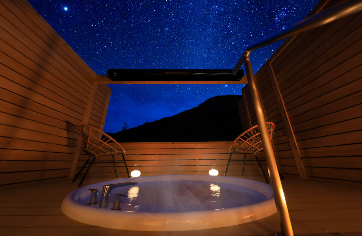 満点の夜空を独占できる露天風呂が魅力。自然に包まれた静かな空間で、心ほどける癒しのひとときをお楽しみください。