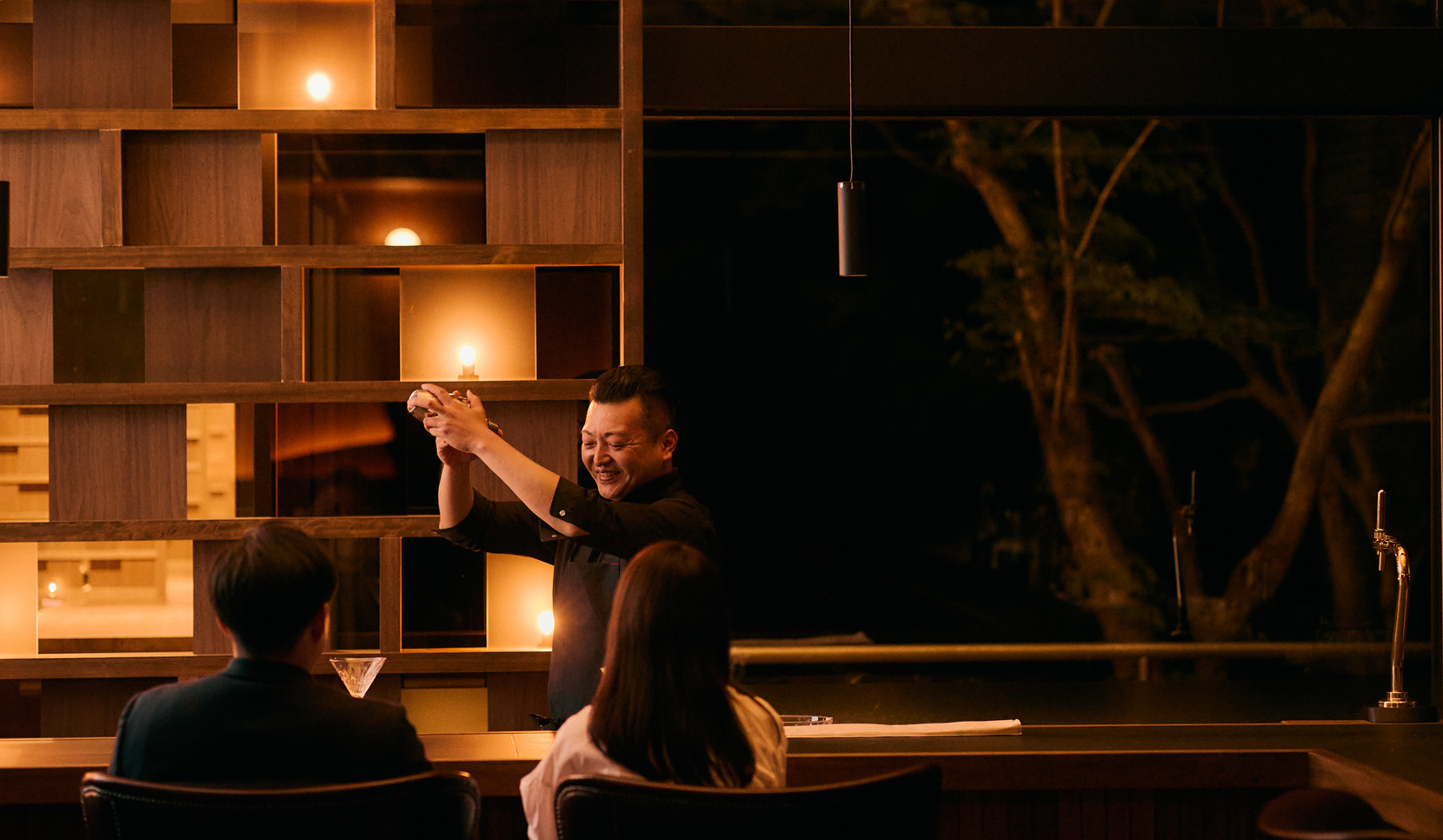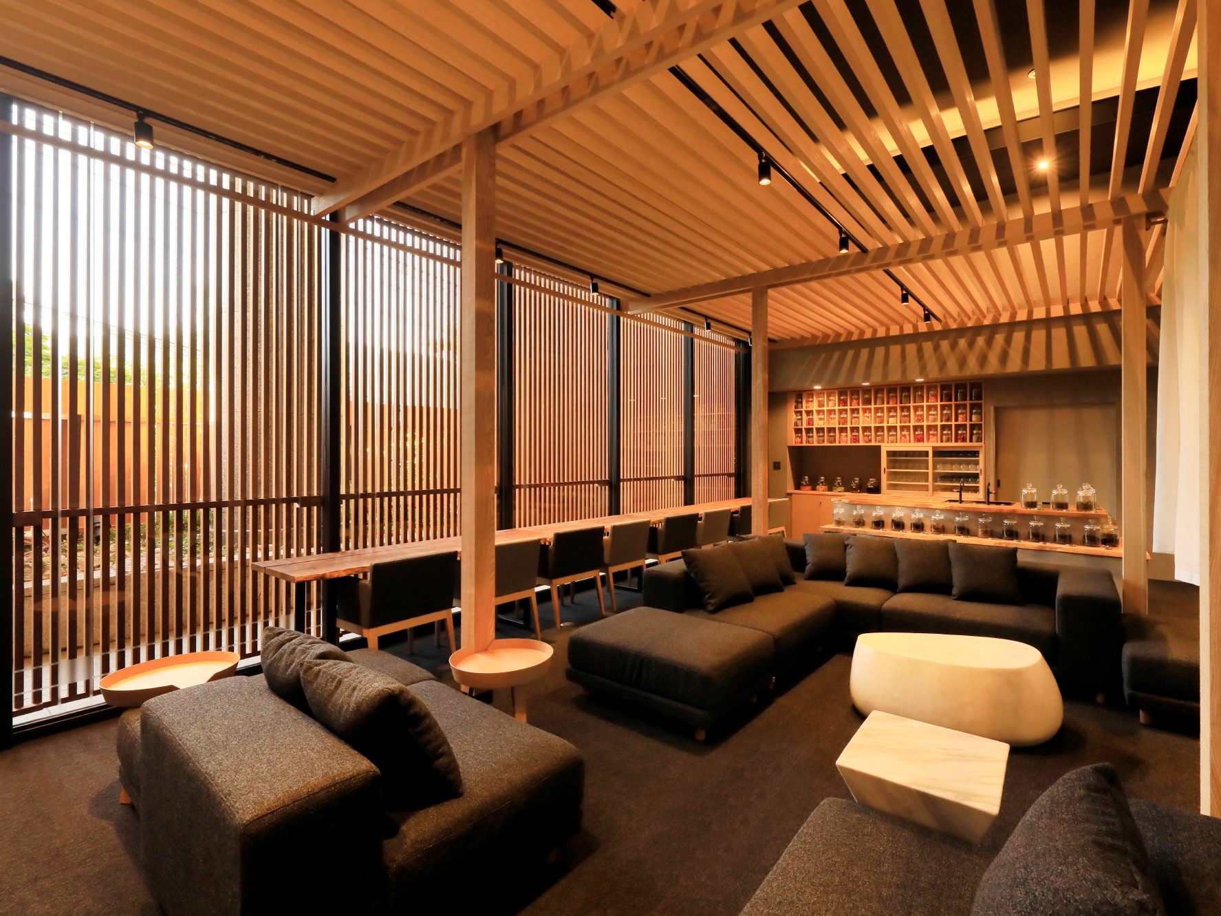 サウナや温泉で体がポカポカに温まった後は、シックな雰囲気のバー「Komorebi」へ。特別な夜をお楽しみいただけます。